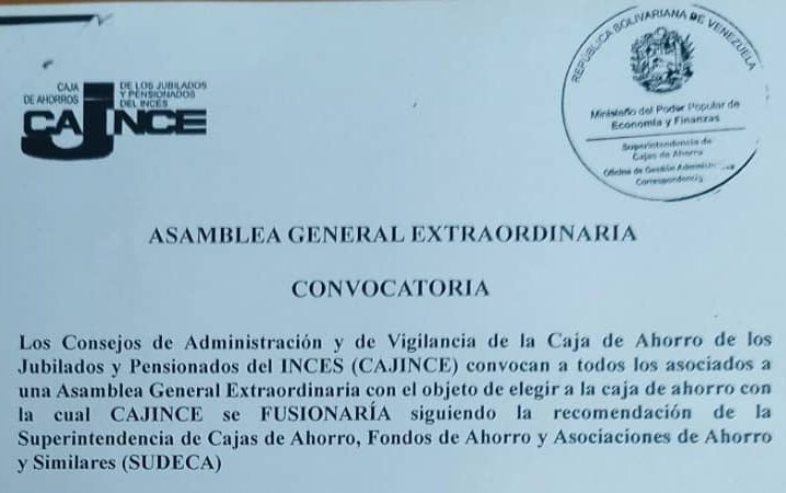 Los Consejos de Administración y de Vigilancia de la Caja de Ahorro de los Jubilados y Pensionados del Inces (CAJINCE) convocan a todos los asociados a una Asamblea General Extraordinaria con el objeto de elegir a la caja de ahorro con la cual CAJINCE se FUSIONARÍA siguiendo la recomendación de la Superintendencia de Cajas […]